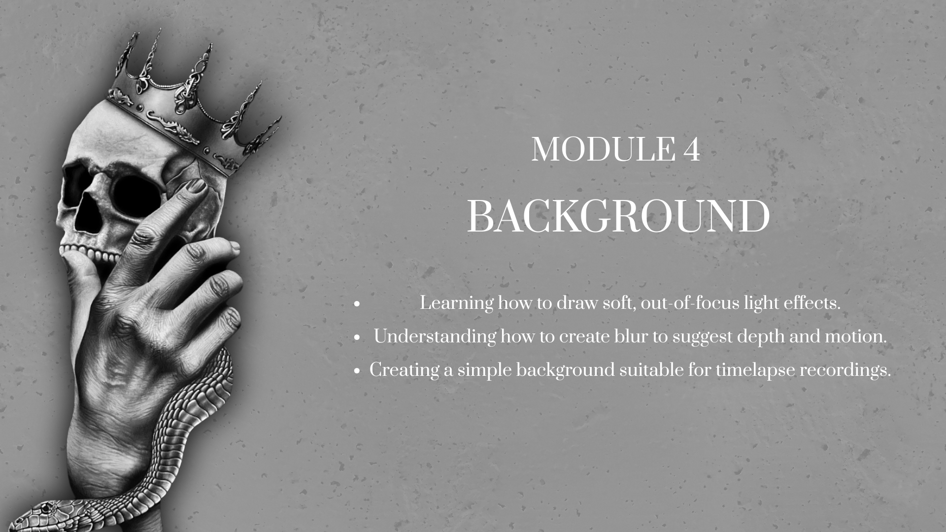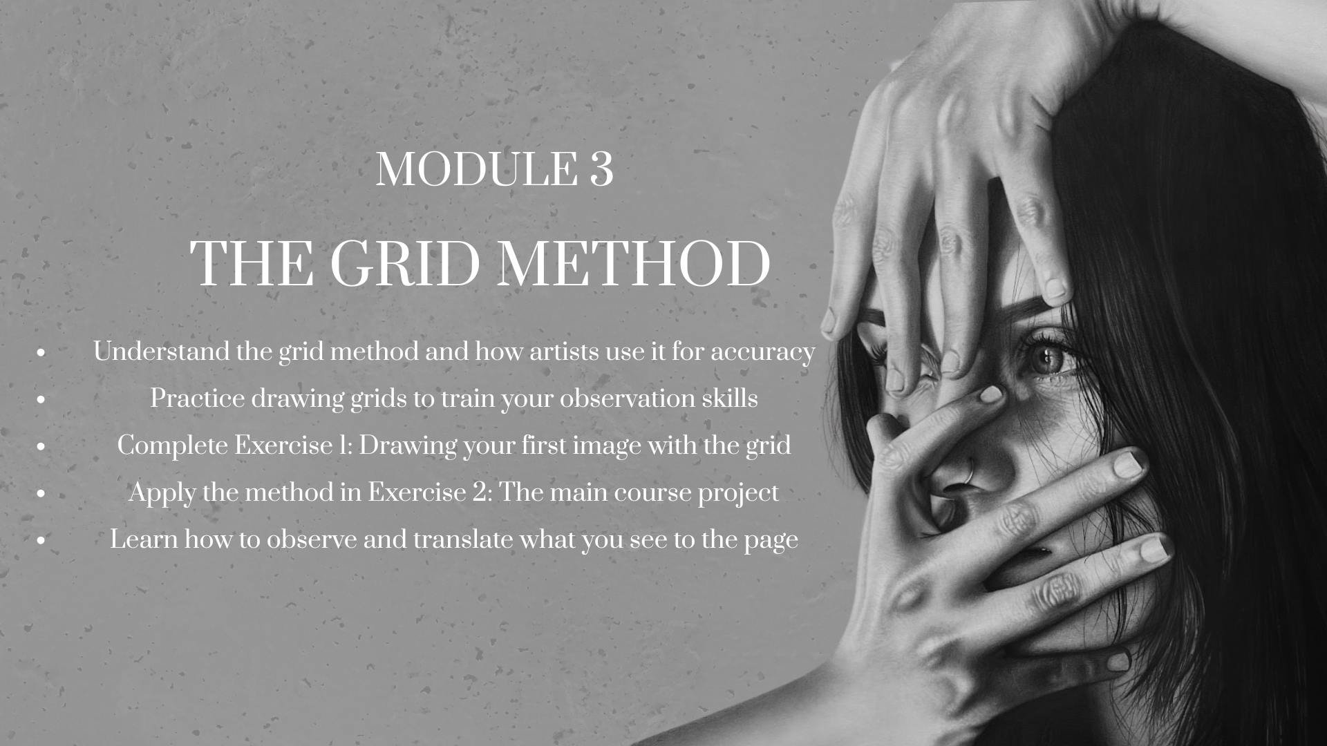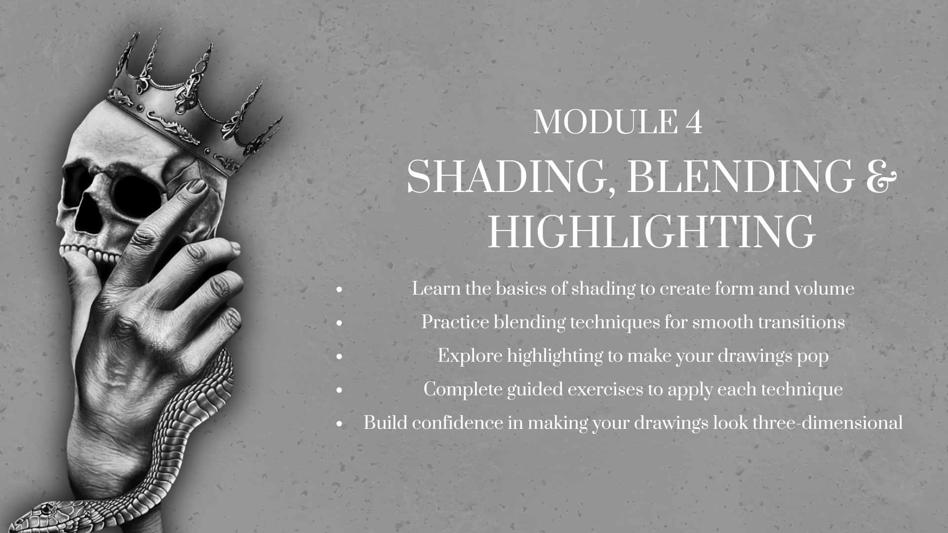 This course includes 5 modules and over 5 hours of guided fundamentals of realism. You’ll also get 25+ full-length tutorials that will help with your art progress! All designed for you to pause, replay, and follow at your own pace.